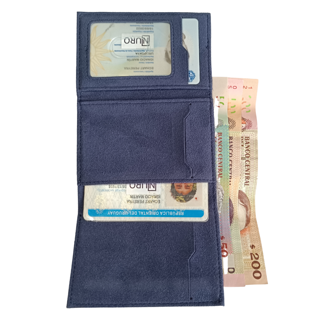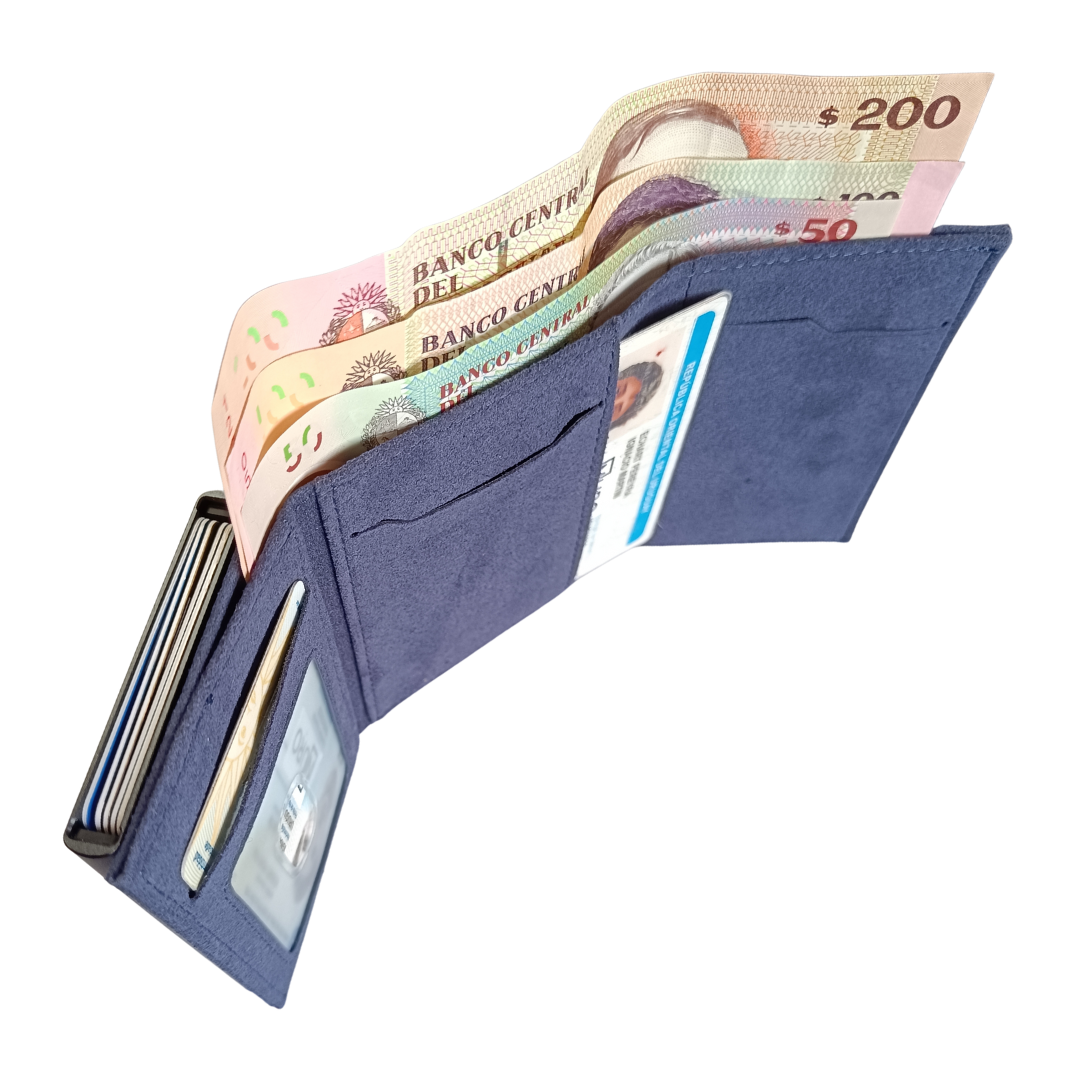 Con un solo clic accedés a tus tarjetas gracias a su sistema de eyección lateral, y su diseño interior desplegable incluye compartimentos organizados para billetes, monedas y documentos. Además, su cierre magnético asegura un uso cómodo y seguro.